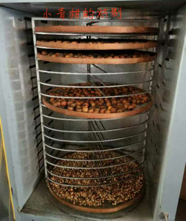 下面的是2018年12月公司用普洱的陳皮與公司的茶葉結(jié)合,制作的小青柑。青柑工藝種類的區(qū)別主要出現(xiàn)在干燥環(huán)節(jié),干燥方式的不同使之形成了不同的風味與口感。烘制時間是18個小時,低溫烘焙,采用60℃左右的溫度,將小青柑烘焙至干燥。時間和成本雖有提高,但比起高溫烘焙工藝來說,口感更好,提香適當,兼以保持了活性,為后期轉(zhuǎn)化保留了空間。